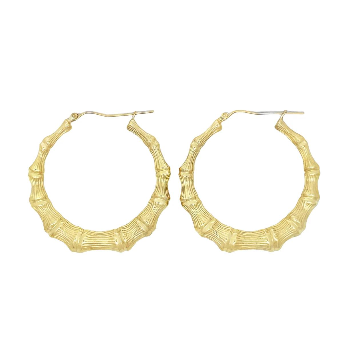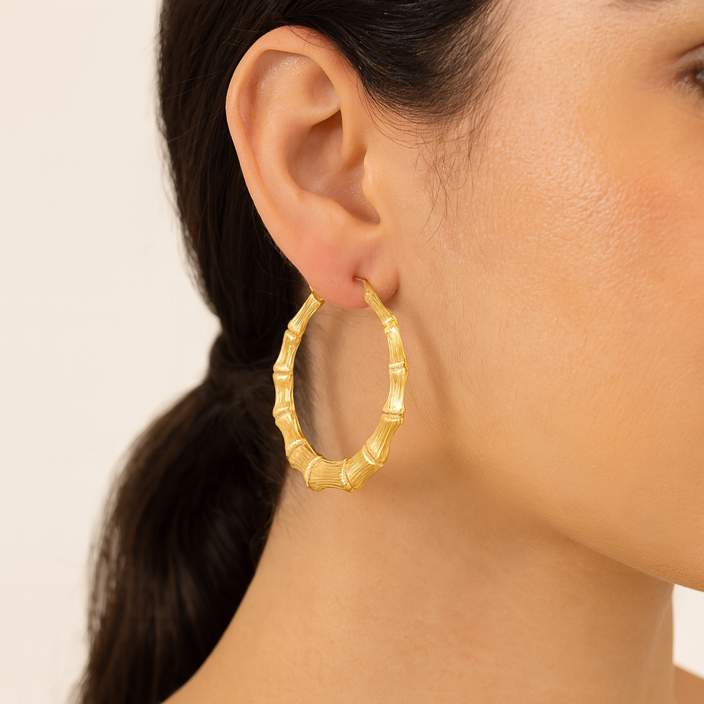- Elevate your style with these stunning gold bamboo-style hoop earrings. Crafted with intricate texture and a bold, natural-inspired design, they add a touch of elegance and uniqueness to any look. Lightweight and comfortable, they’re perfect for everyday wear or special occasions.