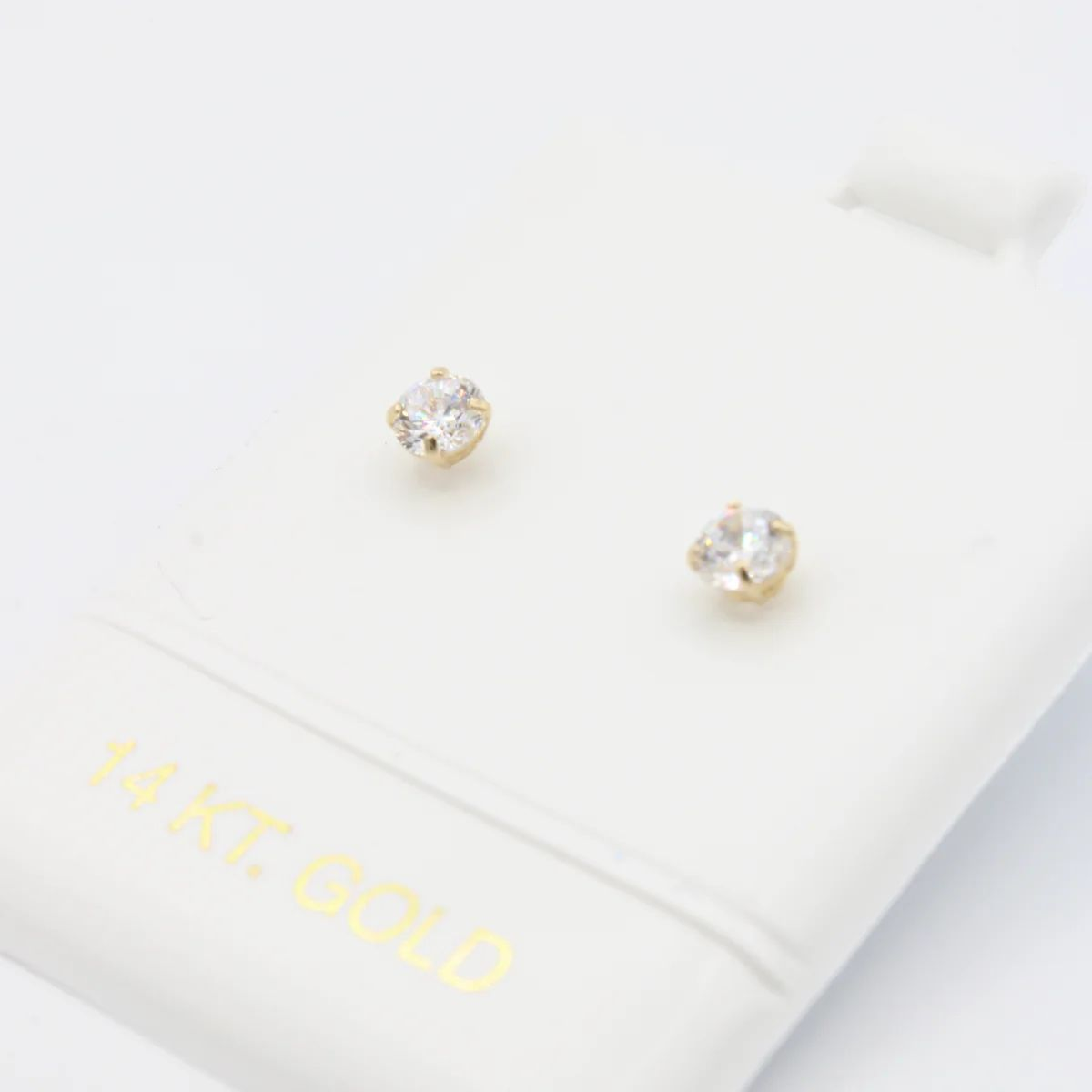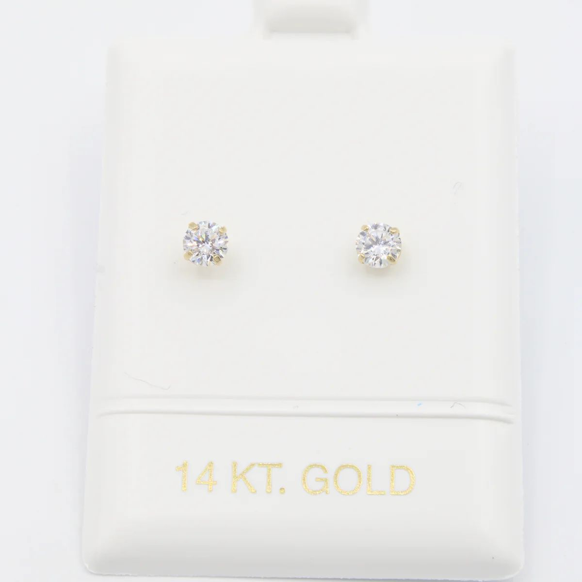 - Timeless and elegant, these 14K gold stud earrings feature brilliant round-cut cubic zirconia stones that sparkle with every movement. Set in a classic four-prong setting, they offer the perfect touch of sophistication for both everyday wear and special occasions.
