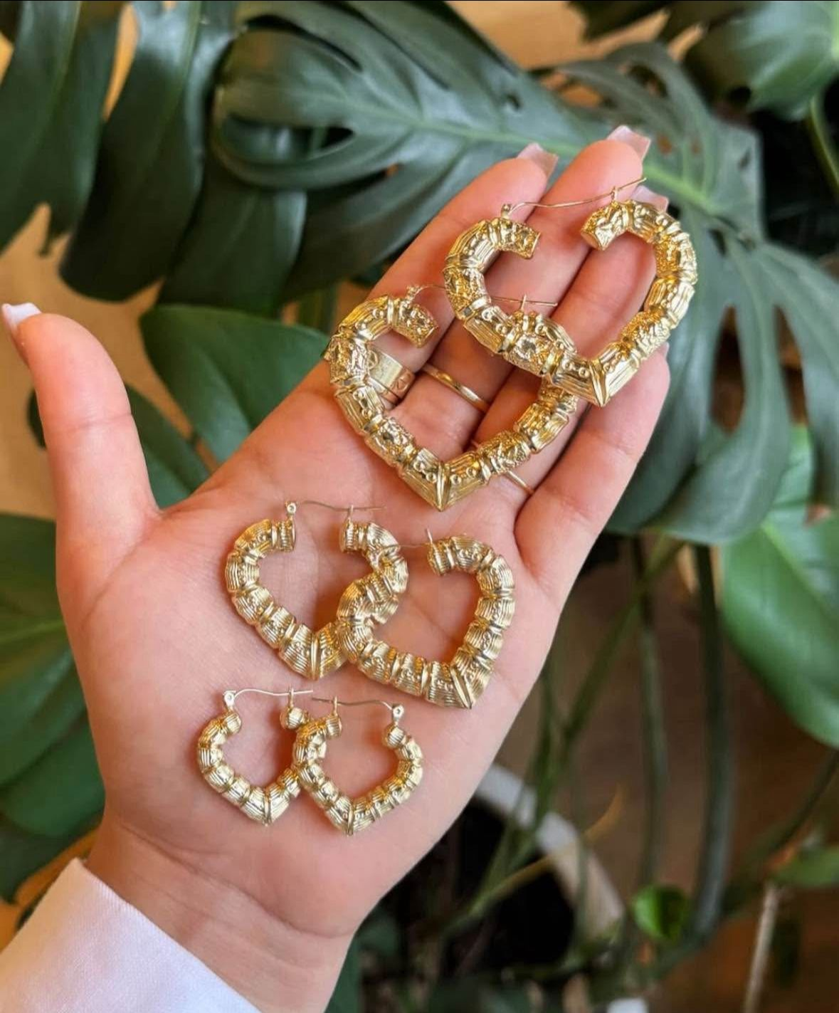 - Make a bold statement with these stunning gold heart-shaped earrings. Featuring a textured design and eye-catching size, they’re the perfect accessory to express your unique style with confidence and charm. Lightweight yet impactful, ideal for special occasions or elevating your everyday look.